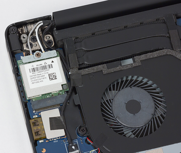 Очень тонкий ноутбук с производительным процессором и дискретной видеокартой сделать тихим довольно сложно. Для создания эффективной системы охлаждения в ноутбуке используется два кулера, связанных друг с другом тепловой трубкой, которая проходит через теплосъемные площадки, установленные на CPU и GPU.