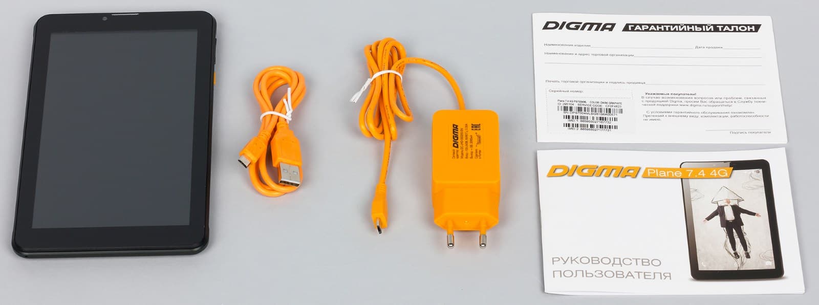 Планшет Digma сопровождают ярко-оранжевые аксессуары — зарядное устройство (5,2 В, 2 А) и отдельный кабель Micro-USB. Также имеется инструкция и гарантийный талон.