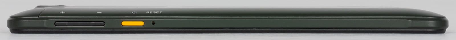 Типовой дизайн разбавляет яркая клавиша выключения. Качелька регулировки громкости окрашена в тон корпусу. Под клавишей выключения находится весьма полезный для устройств такого класса элемент интерфейса, которого нет у Teclast X70 3G — отверстие принудительной перезагрузки.