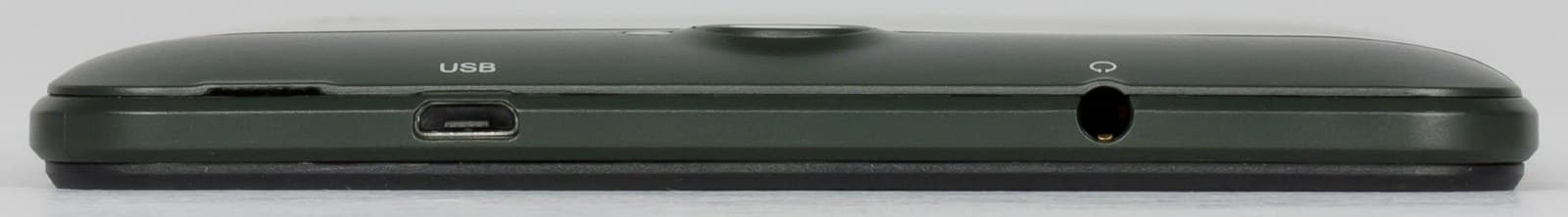 Внизу находится только отверстие микрофона. Судя по его расположению, планшет рассчитан скорее, на правшей. Чуть выше находится отверстие мультимедийного динамика и необходимая информация о продукте. Качество звука низкое, на уровне типичных бюджетных планшетов, как и запас громкости. Планшет, лежащий на столе, почти не слышно.
