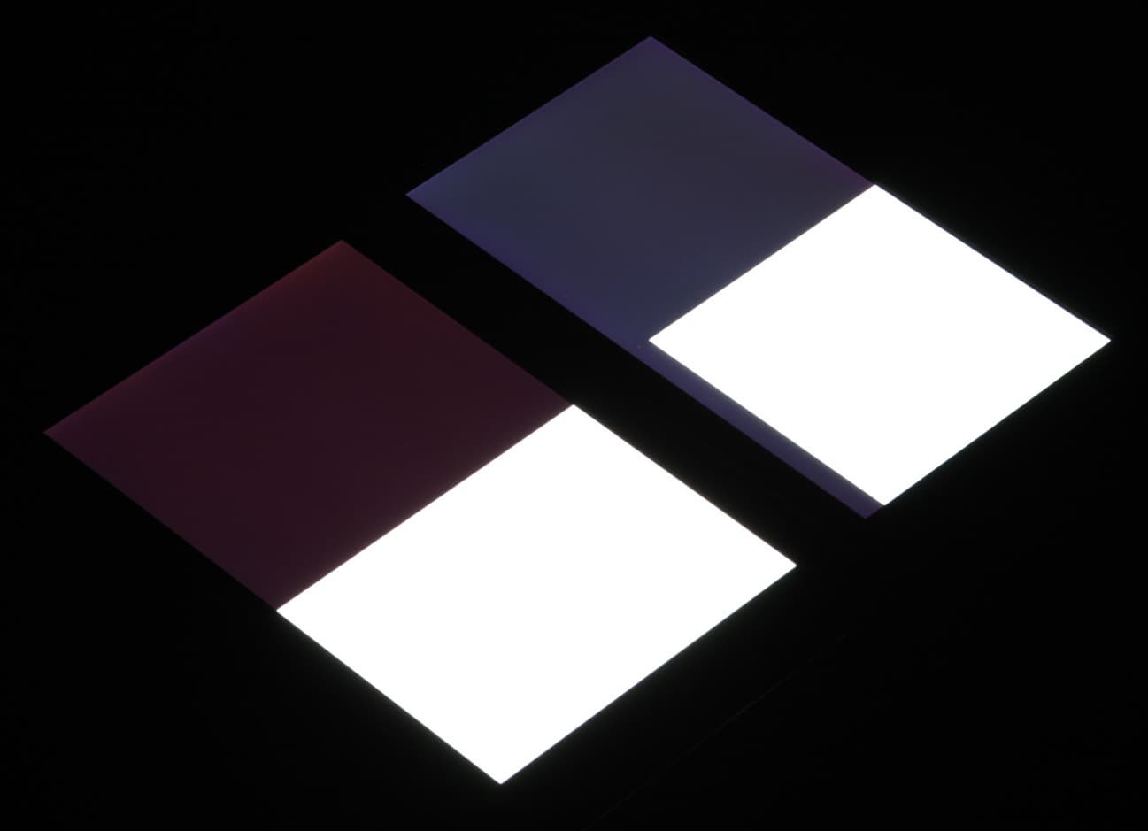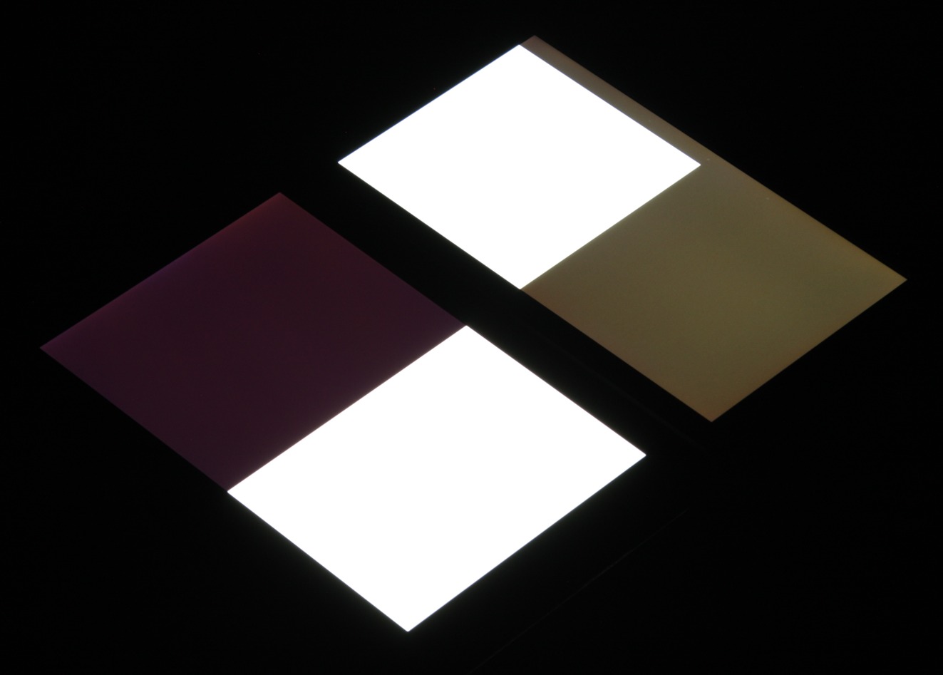 Отметим некоторую неравномерность яркости и цветового тона. Теперь под углом примерно 45 градусов к плоскости и к стороне экрана: