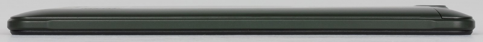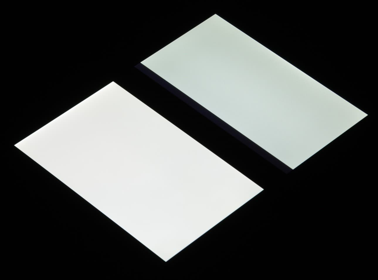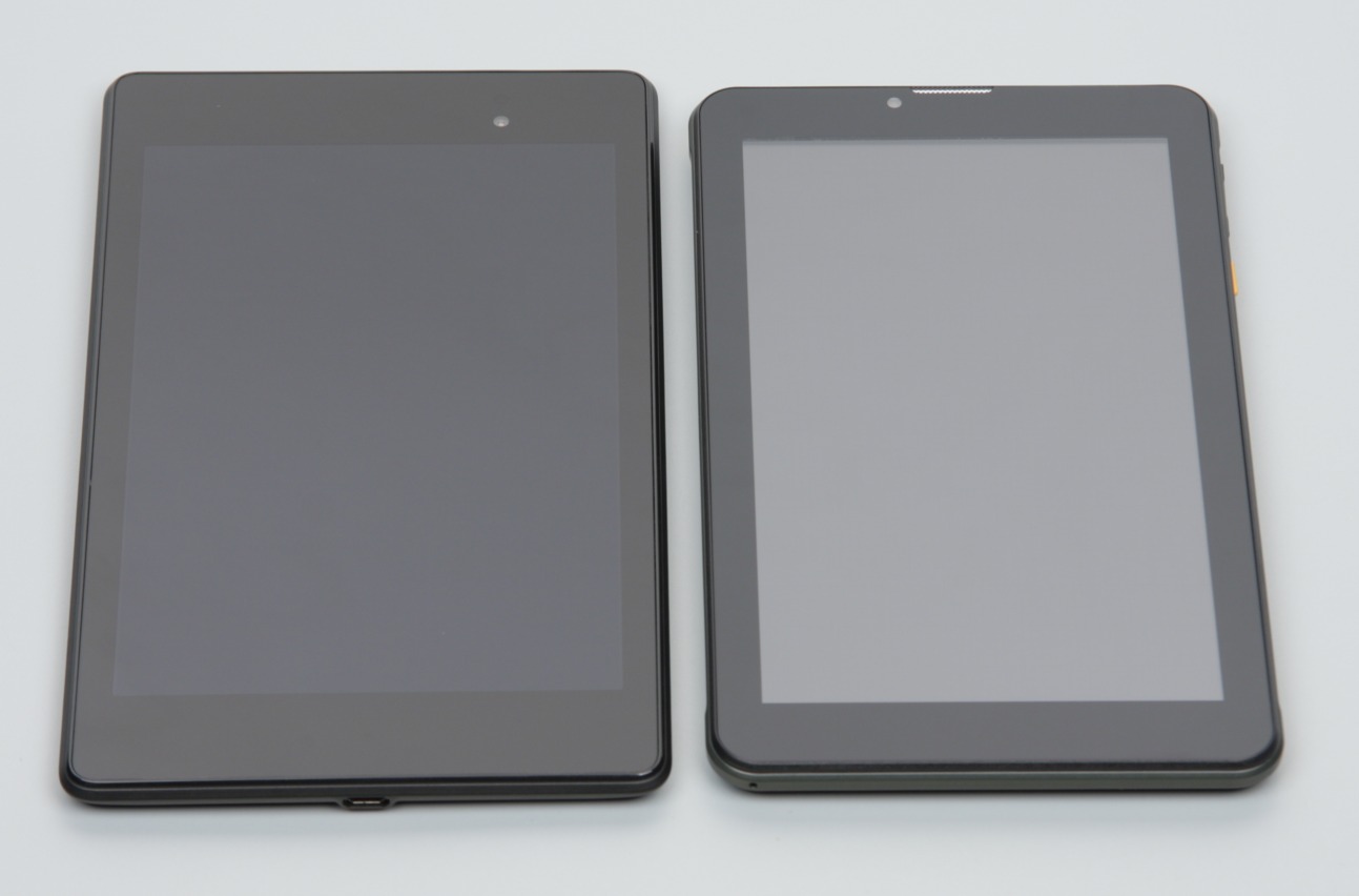 Лицевая поверхность экрана выполнена в виде стеклянной пластины с зеркально-гладкой поверхностью, устойчивой к появлению царапин. Судя по яркости отраженных объектов, антибликовые свойства экрана заметно хуже, чем у Google Nexus 7 (2013) (далее просто Nexus 7). Поверхность самой матрицы под стеклом слегка матовая, поэтому экран отражает как прямые источники света (внешней поверхностью), так и рассеянный свет (поверхностью матрицы), это уменьшает читаемость в условиях сильной внешней засветки. Для наглядности приведем фотографию, на которой в выключенных экранах обоих планшетов отражается белая поверхность (Digma Plane 7.4 4G — справа, далее на всех следующих сравнительных фотографиях тестируемый планшет расположен выше Nexus 7):