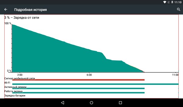| Режим чтения (Moon+ Reader, автолистание, яркость 100 кд/м²) | 8 ч. 45 мин. | 12 ч. 30 мин. | 11 ч. 51 мин. | 8 ч. 14 мин. | 14 ч. 13 мин. |