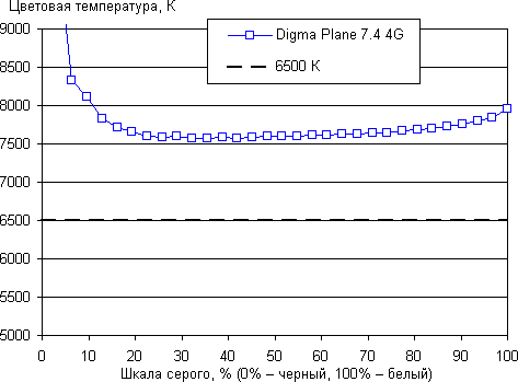Баланс оттенков на шкале серого компромиссный, так как цветовая температура несильно выше стандартных 6500 К, но отклонение от спектра абсолютно черного тела (ΔE) больше 10, что даже для потребительского устройства считается плохим показателем. Однако при этом вариация цветовой температуры и ΔE небольшая, что положительно сказывается на визуальном восприятии цветового баланса. (Темные области шкалы серого можно не учитывать, так как там баланс цветов не имеет большого значения, да и погрешность измерений цветовых характеристик на низкой яркости большая.)