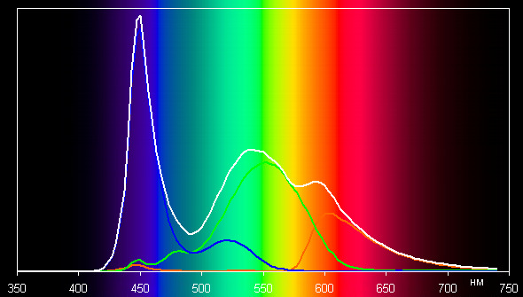 Видимо, светофильтры матрицы существенно подмешивают компоненты друг к другу. Спектры это подтверждают: