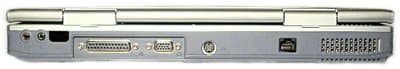 Сзади: сетевой (RJ-45), S-video, выход на внешний монитор, разъем LPT, инфракрасный порт, микрофонный вход и вывод на наушники (на мой взгляд, лучше бы последние два разъема были вынесены на боковую грань).