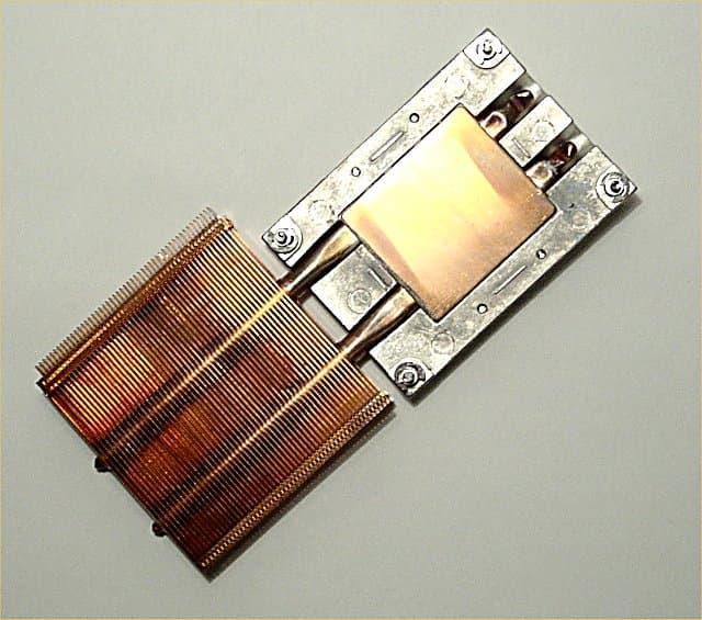 А вот у процессора очень хорошая собственная система охлаждения. Для него предусмотрен отдельный вентилятор: воздух забирается сверху (отверстие в левой части решетки над клавиатурой), проходит через медный радиатор (который соединен трубками с охлаждающей жидкостью с платой, отводящей тепло от процессора) и выбрасывается снизу, влево и сзади.