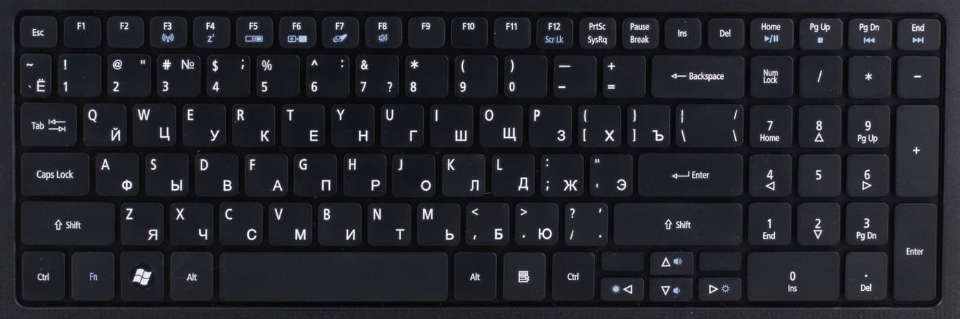Традиционно для Acer регулировка громкости и яркости экрана реализована на клавишах курсора. Курсором часто пользуешься, т. е. руки там лежат часто, да и на ощупь найти эти клавиши просто. Неудобно, что клавиша отключения звука туда не поместилась, она по-прежнему в верхнем ряду и искать ее нужно отдельно. Кстати, в верхнем ряду можно: включить и выключить беспроводные интерфейсы, отправить ноутбук в режим сна, переключить мониторы, отключить тачпад (очень полезная возможность, потому что тачпад тут неудобный и мешает) и выключить звук.