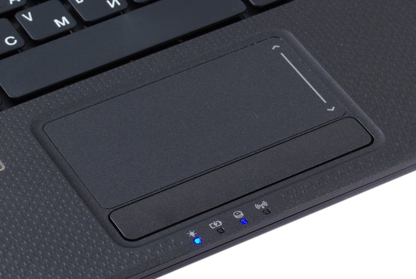 Клавиши тачпада выполнены в виде единой качельки, нажимать на которую надо ближе к краям. Нажатие мягкое, при нажатии слышен щелчок — почему-то при нажатии левой клавиши щелчкой звонкий, при нажатии правой — глухой.
