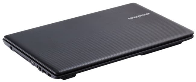 Корпус ноутбука сделан из дешевого шероховатого пластика, но текстурированная поверхность до какой-то степени сглаживает это впечатление. По результатам использования, могу сказать, что пластик не произвел впечатления особо крепкого. Сборка корпуса вполне неплохая, ничего не скрипит. Переносить открытый и включенный ноутбук за угол можно без проблем и опасений. А вот крышка слабая: пластик охотно гнется в любых направлениях, что вызывает вполне обоснованные опасения за экран. Поэтому носить ноутбук (и открытый дома, и закрытый) следует аккуратнее. Хотя для домашней машины, которая большую часть жизни проводит на одном месте, на столе, это не принципиально.