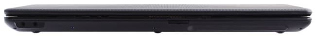 На левой панели, ближе к краю, расположен разъем для штекера питания. Сам штекер угловой, шнур можно легко увести за матрицу. Правда, если приподнимать и двигать ноутбук по столу, то провод тут же попадает под него, но это недостаток почти всех ноутбуков с такой конструкцией. Вставлять и вытаскивать штекер удобно. Далее идет большая решетка вентиляции, выход VGA, сетевой разъем, выход HDMI и порт USB. Все выходы расположены близко к передней грани, иногда это мешает в работе.