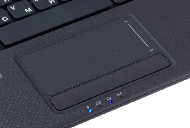 Остальные индикаторы расположены перед тачпадом. При работе их превосходно видно, если смотреть сбоку, то можно увидеть их и при закрытой крышке. Индикаторов четыре: работа ноутбука (горит синим при работе, мигает в режиме сна), индикатор заряда батареи, индикатор обращения к диску и индикатор беспроводных сетей. Диоды хорошо читаются при работе с ноутбуком.
