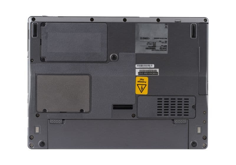 На нижней стороне находится несколько отсеков для доступа к отдельным комплектующим. Самый маленький скрывает карту Sierra Wireless MC8755V (кстати, на самом модуле можно прочитать его IMEI, если вдруг понадобится). Крышка этого модуля — единственная, на которой находятся дополнительные вентиляционные отверстия для него. Собственно SIM-карта беспроводного модуля устанавливается под батарею в стандартный слот. За второй крышкой, большего размера, находится единственный слот памяти ноутбука. В нашем экземпляре он был занят модулем Samsung 1 ГБ, PC2-5300S-555-12-A3 (M470T2864AZ3-CE6). И третья крышка закрывает 1,8” жесткий диск. Отметим, что сам диск закреплен в резиновых «кубиках» и подключен на гибком шлейфе. Дополнительно нижняя часть ноутбука из магниевого сплава покрыта в нескольких местах «заплатками» из нубука. С таким решением для теплоизоляции мы уже встречались в имиджевой модели Q2010. Разъем для порт-репликатора, расположенный здесь же, в неактивном состоянии зарывается шторками.