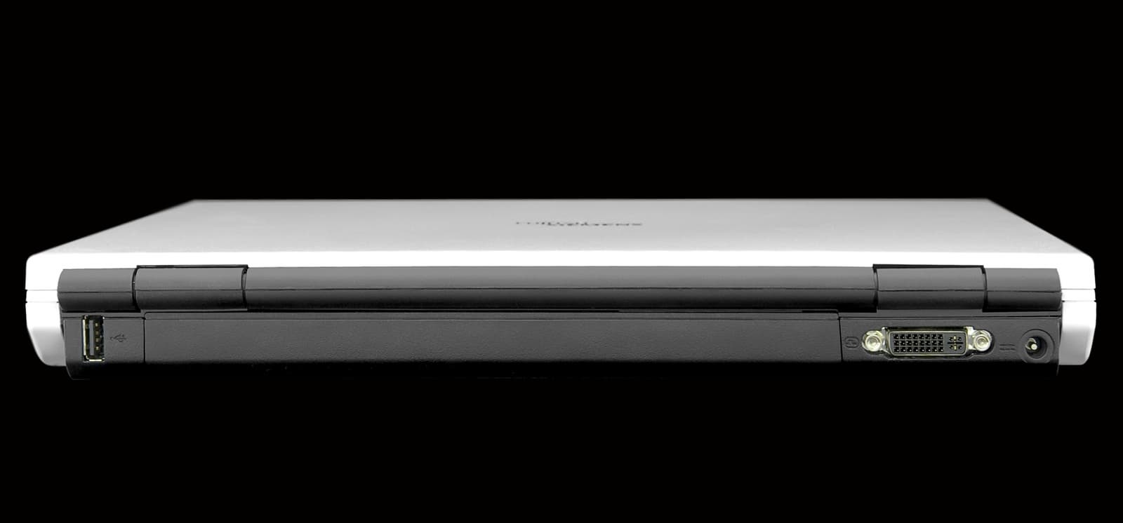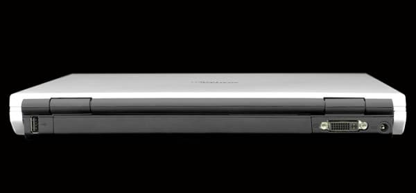 Сзади расположены: разъем питания (обратите внимание, что он расположен с самого края, то есть штекер можно вставить на ощупь, не нагибаясь за экран, это удобно), сам штекер угловой, и если его заправить за экран, то он будет мешать следующему порту. В этой модели нет аналогового выхода на внешний монитор VGA, только цифровой порт DVI. Впрочем, аналоговый монитор или проектор можно подключить, используя переходник или специальный кабель. Почти всю поверхность занимает батарея, а с другой стороны находится еще один порт USB, тоже расположенный вертикально. В принципе, немного привыкнув, в него можно втыкать штекер (например, мышки) тоже на ощупь.