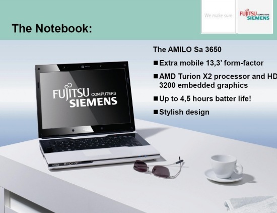 Олег начал свое выступление с утверждения, что Amilo GraphicBooster — неплохой технологичный подарок. Вполне возможно, когда-то в будущем — да. Проблема в том, что на данный момент у компании есть лишь один продукт, куда его можно подключить: ноутбук SA-3650. Кстати, давайте взглянем на него внимательнее.