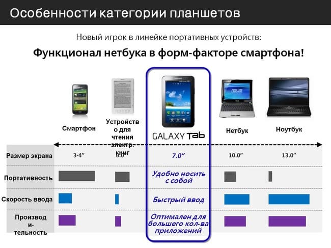 Вот как Samsung позиционирует Galaxy Tab в ряду другой продукции. Устройства расставлены по размерам экрана, поэтому электронные книги получились ближе к нему, чем смартфоны, однако по функциональности должно быть наоборот: в этом плане Galaxy Tab отличается от смартфона только большим экраном, но и корпус у него больше. Я также не понял, почему он оптимален для большого количества приложений, на мой взгляд, он не подходит не больше, чем любой смартфон с системой Android, ну разве что разрешение побольше (хотя это может быть как плюсом, так и минусом).
