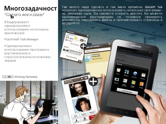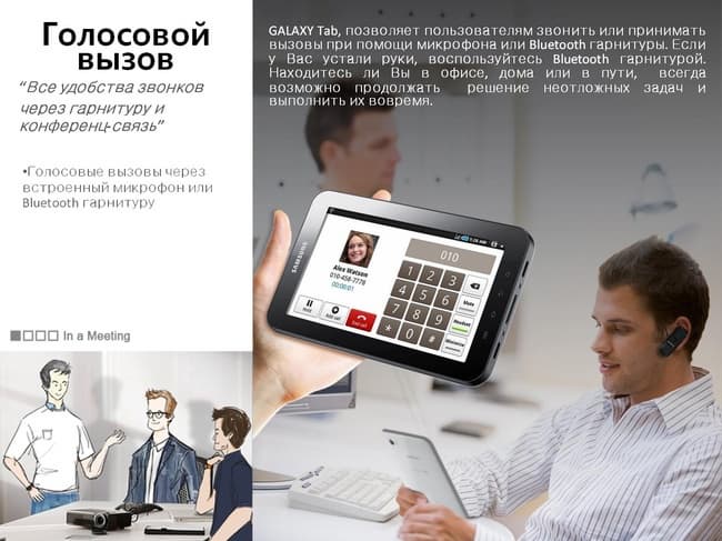 Честно говоря, с трудом представляю себе человека, у которого Galaxy Tab будет единственным телефоном — это банально неудобно. Намного более интересно использовать его в качестве инструмента для видеозвонков, если сотовая сеть поддерживает эту возможность — или если есть Wi-Fi. Последним достоинством для бизнеса считается почта, в которой «слева список писем, а справа их текст — как в Outlook» (цитата).