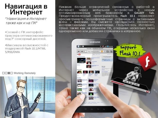 Посмотреть презентацию планшета на флеш можно в специальном разделе сайта Samsung. Только приглушите звук, ибо там очень навязчивая музыка.