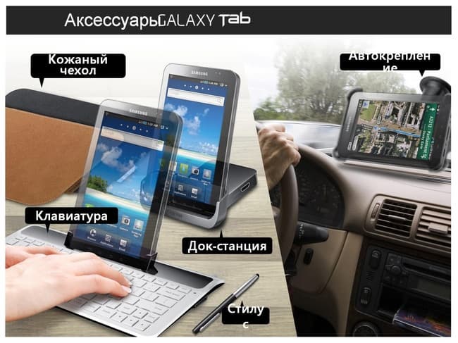 К планшету поставляются разные аксессуары: стилус, докстанция и клавиатура. Есть и автокрепление.