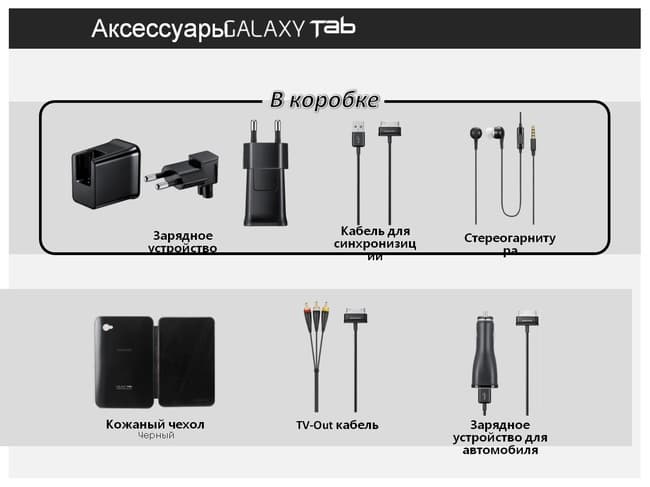 А вот что получает покупатель Galaxy Tab в комплекте с устройством.