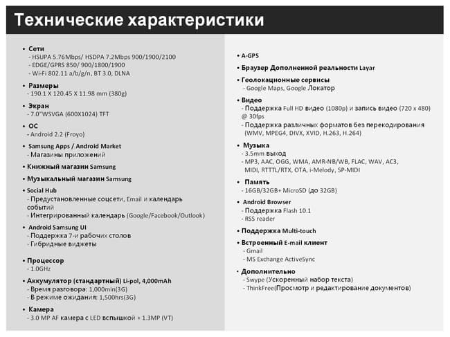 Прежде чем переходить к тому, зачем Galaxy Tab нужен, посмотрим на его аппаратные характеристики. С технической точки зрения планшет находится на современном уровне: аппаратная платформа с двухъядерным гигагерцовым процессором Cortex A8, Android версии 2.2 (Froyo). Экран 1024×600 точек. Объем встроенной памяти составляет 16 или 32 ГБ, расширяемая память — до 32 ГБ, формат внешних карт — MicroSD. Указано еще 4 ГБ для памяти приложений (NAND Flash), 4 ГБ оперативной памяти + 1 ГБ для сетевого подключения. У Galaxy Tab мощный аккумулятор — 4000 мА·ч. Заявлено до 7 часов работы при воспроизведении видео. У планшета две камеры: спереди — для проведения конференций, сзади — для съемок фото и видео.