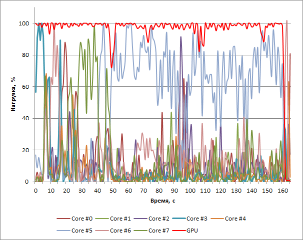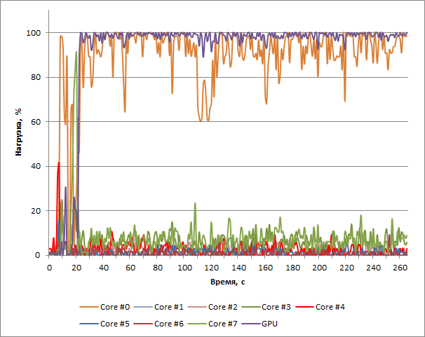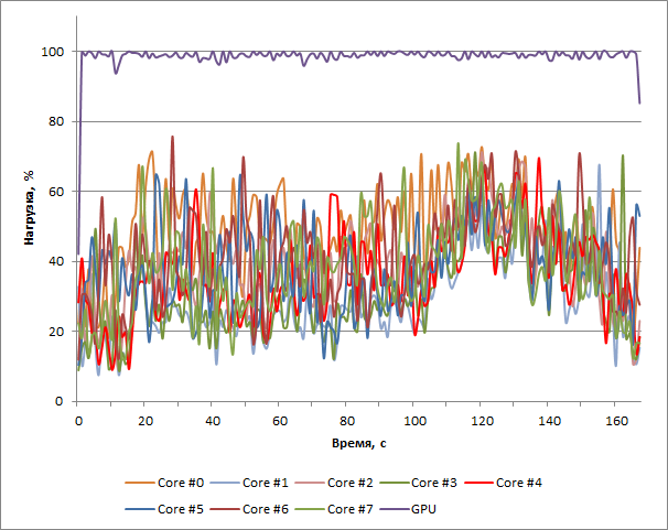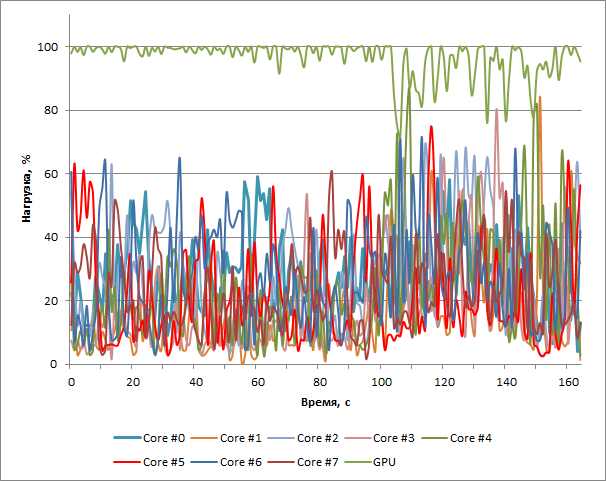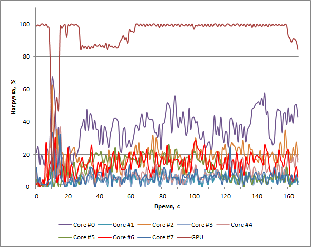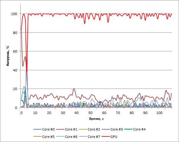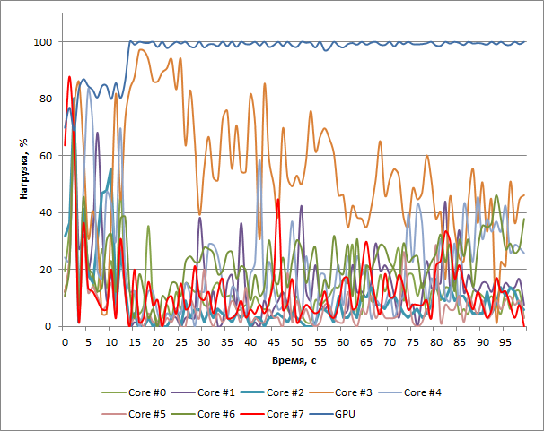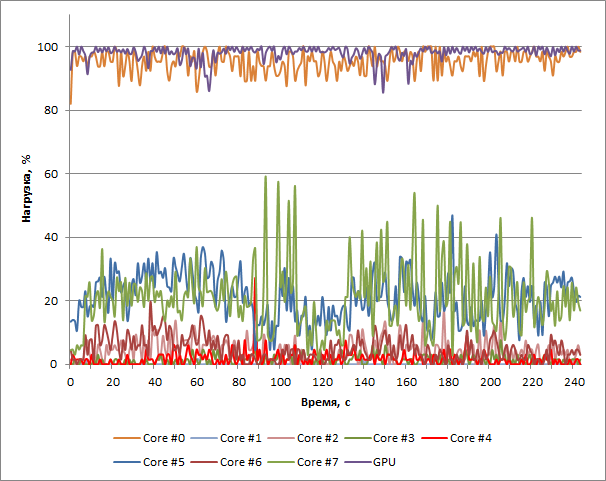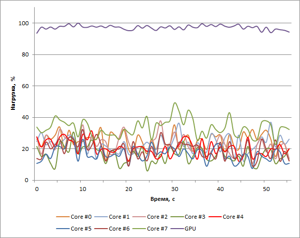К примеру, для четырехъядерного процессора Intel Core i7-4770K (восемь логических ядер с учетом технологии Hyper-Threading) c графическим ядром Intel HD Graphics 4600 загрузка ядер процессора следующая: в режиме настройки на минимальное качество (при разрешении 1920×1080) одно логическое ядро процессора получает среднюю загрузку порядка 30%, а средняя загрузка всех остальных ядер процессора не превосходит 5%. Ну а загрузка графического ядра очень высокая и составляет порядка 100%.