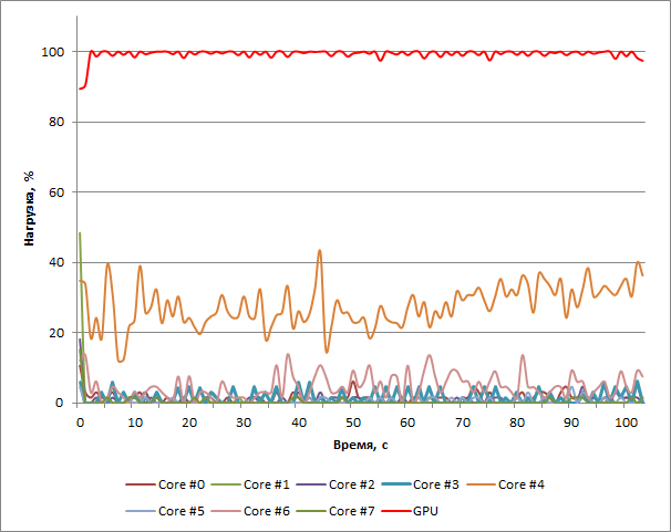 В режиме настройки на максимальное качество загруженным остается только одно ядро процессора, причем средняя загрузка составляет порядка 90%. Загрузка графического ядра опять-таки составляет порядка 100%.