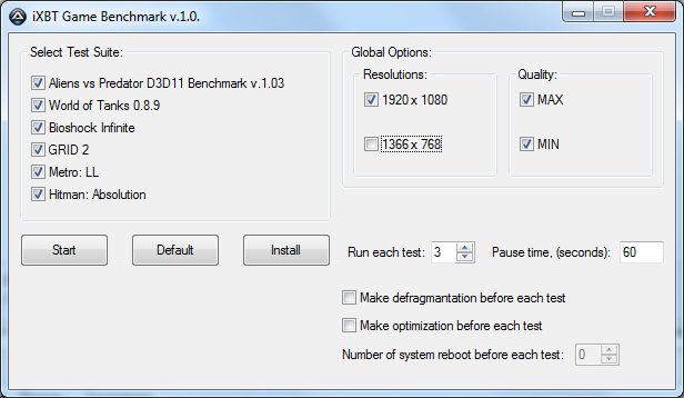 Также в нашем бенчмарке предусмотрена возможность запуска каждой игры в двух разрешениях (1920×1080 и 1366×768) и в двух режимах настройки игр (на максимальное и минимальное качество).