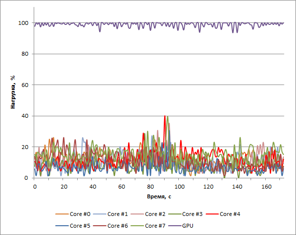 В нашем примере с процессором Intel Core i7-4770K в режиме настройки на минимальное качество графическое ядро загружено на 100% во время теста, а нагрузка на ядра процессора составляет порядка 40%.