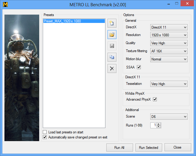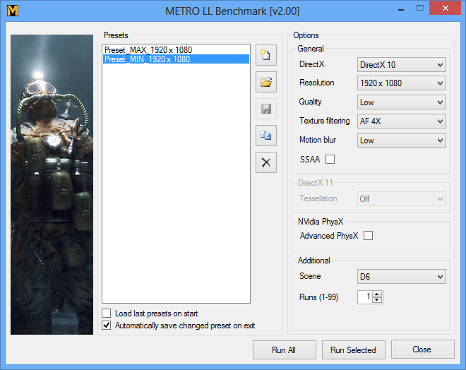 Настройка бенчмарка производится в отдельном диалоговом окне перед его запуском. Настройки бенчмарка Metro: LL на режимы максимального и минимального качества приведены на скриншотах: