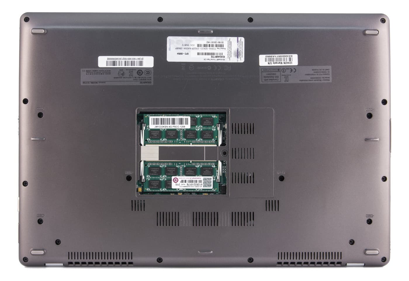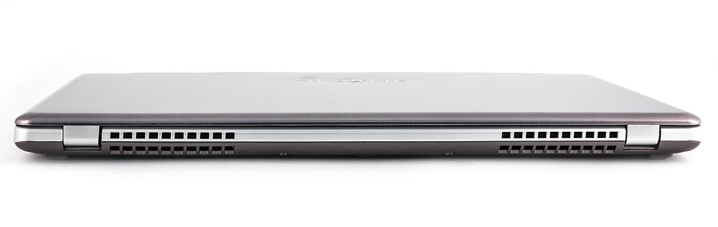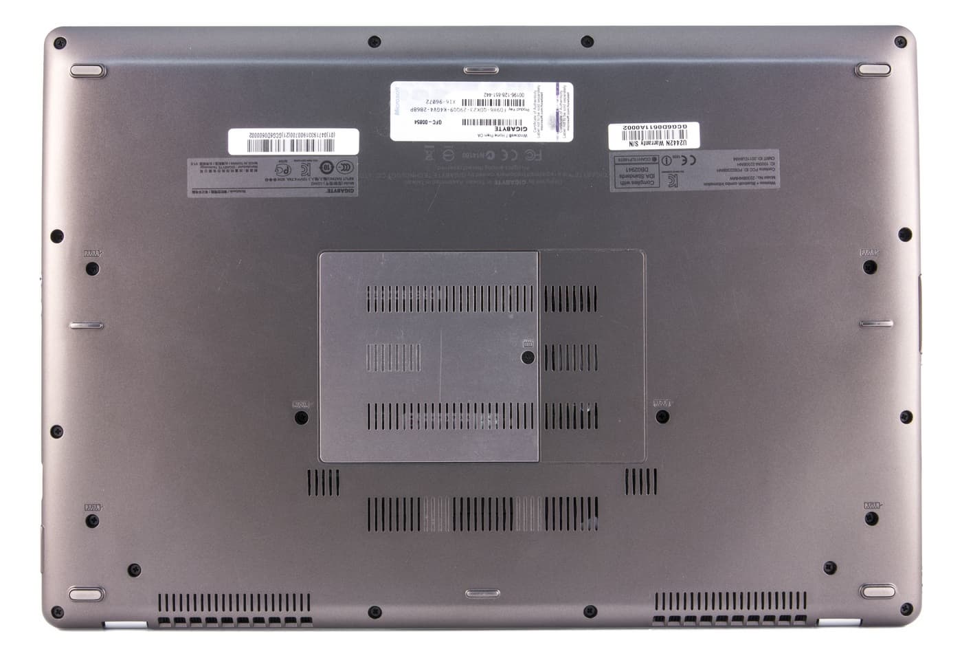 Заднюю грань перекрывает открытая крышка, так что порты там не разместишь. Зато у Gigabyte U2442n здесь находятся вентиляционные решетки. Их две (в этом ультрабуке две тепловые трубки, два радиатора и вентилятора).