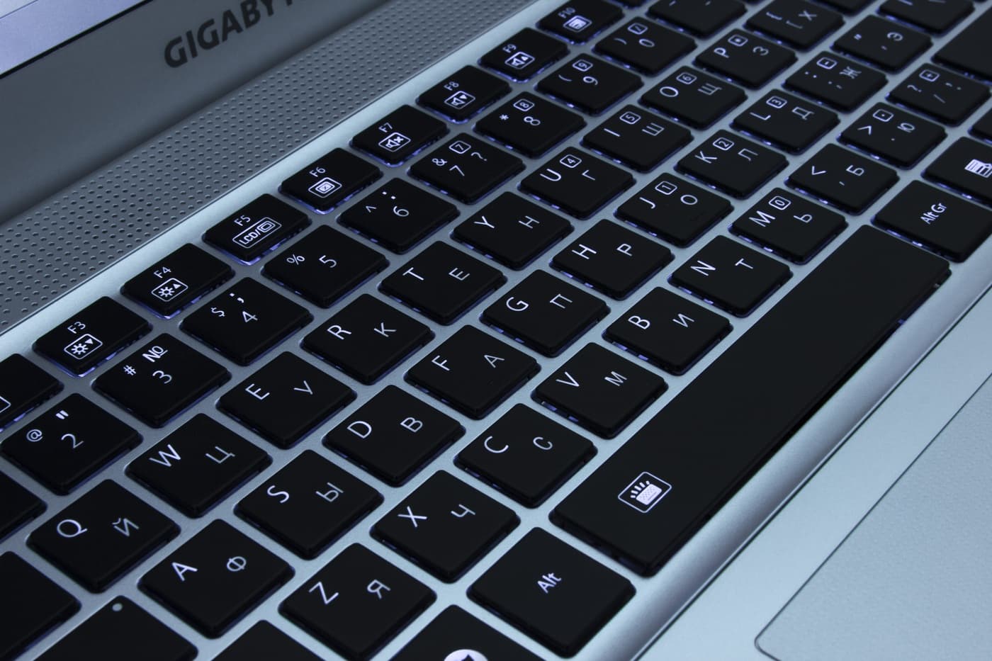 Сразу поговорим о тачпаде. Сейчас, с подачи Apple, в моде гладкие стеклянные тачпады со своеобразными ощущениями от касания. На этом фоне явно традиционный тачпад Gigabyte U2442n выглядит даже свежо. У него пластиковая поверхность, покрытая небольшими впадинками, которые дают хорошее ощущение обратной связи. Тачпад обладает хорошими настройками ускорения, курсор по экрану перемещается быстро и точно. Важно отметить, что при печати (хотя я печатал на этом ноутбуке не очень много) почти не задеваешь ладонью за тачпад. Хотя пару это все-таки случалось. Тачпад можно отключить сочетанием Fn+F10.