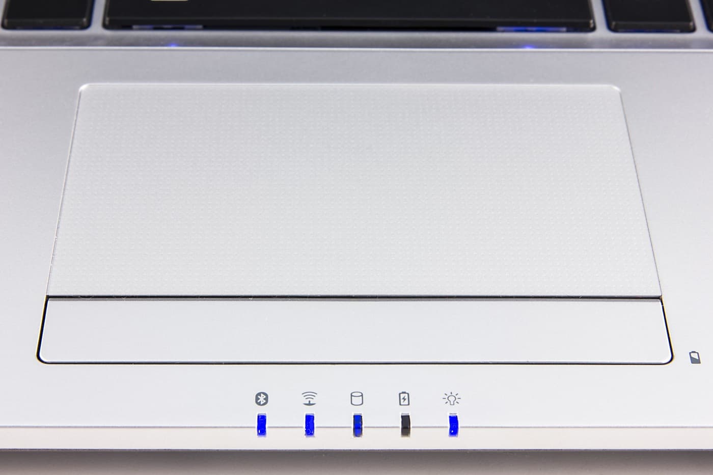 У тачпада есть две выделенные кнопки (в современных ноутбуках нажимать следует на саму поверхность тачпада). Они сделаны в виде одной качельки и по ощущениям — из тонкой пластмассы, которая играет под пальцами. Нажимаются они достаточно тихо и легко, с глухим щелчком переключателя.