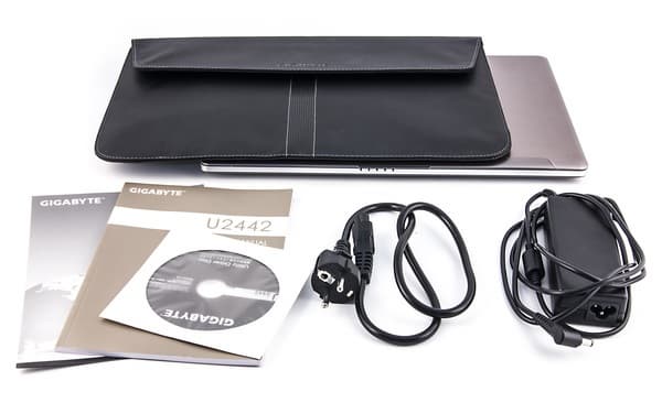 Коробка Gigabyte U2442n сделана из простого черного картона, внутри ноутбук и все аксессуары уложены в аккуратную картонную «книжку», вполне себе удобную и неплохо выглядящую.