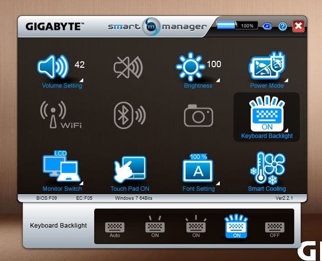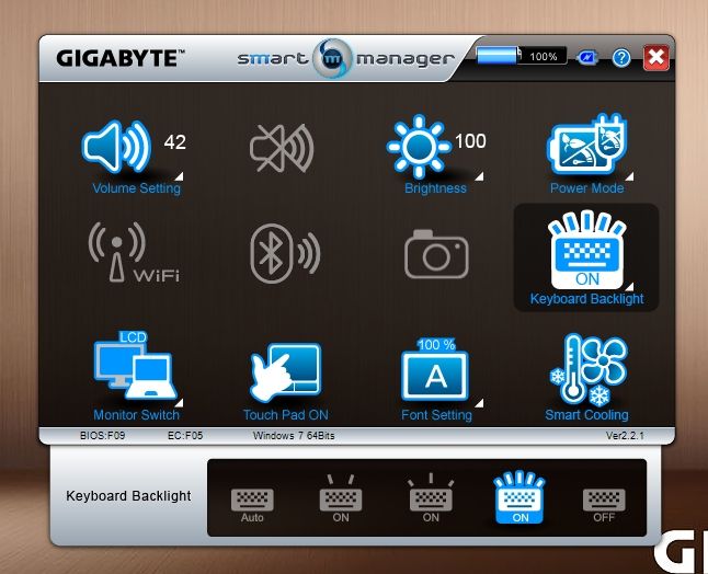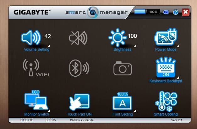 У Gigabyte U2442n всего одна дополнительная кнопка, расположена слева, рядом с кнопкой питания. Эта кнопка вызывает Smart Manager, небольшую сервисную утилиту, которая позволяет наглядно управлять функциями ноутбука. О ней мы поговорим ниже.