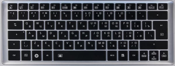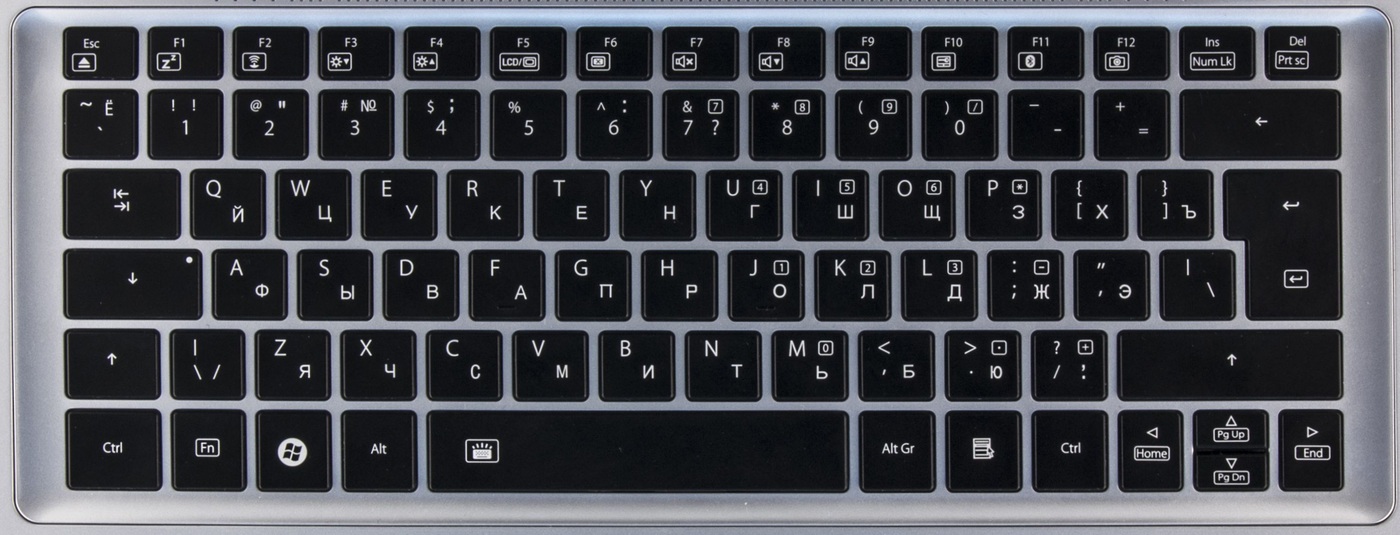 Раскладка европейского типа, т. е. с вертикальным Enter и дополнительной клавишей «» между левым Shift и Z. При печати эта клавиша очень мешает, да и до Enter приходится тянуться дальше (и на пути встает вторая клавиша «»). Помимо того, здесь вообще убраны клавиши надкурсорного блока (они сделаны в виде сочетаний Fn+ клавиши курсора). Сам курсор тоже неудобен: стрелки вверх и вниз сделаны половинного размера по вертикали, так что их очень часто нажимаешь вместе. Больше претензий к клавиатуре нет.
