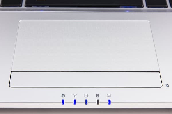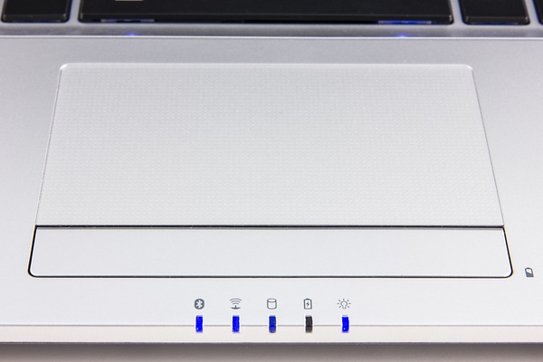 Индикаторы тоже расположены очень и очень традиционно: на передней грани, перед тачпадом. Индикаторов всего пять: отдельно Wi-Fi и Bluetooth, обращение к жесткому диску, индикатор батареи (зарядка/готовность), индикатор работы. Индикатор батареи не реагирует на отключение внешнего питания при заряженной батарее (не горит в обоих случаях).