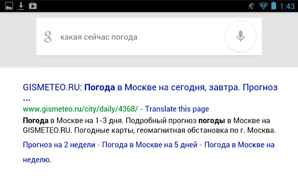 Русский язык Google Now тоже понимает, но информацию отображает только в виде стандартной поисковой выдачи Google.