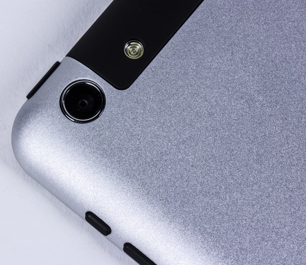 Сзади планшет полностью охватывает солидная по толщине алюминиевая пластина, формирующая основную массу планшета. В ее верхней части имеется пластиковая вставка (этот дизайнерский ход нам знаком по планшету Iconbit NETTAB Skat 3G Quad). Закреплена она не слишком надежно: в тестовом экземпляре мы столкнулись с люфтом и поскрипыванием.