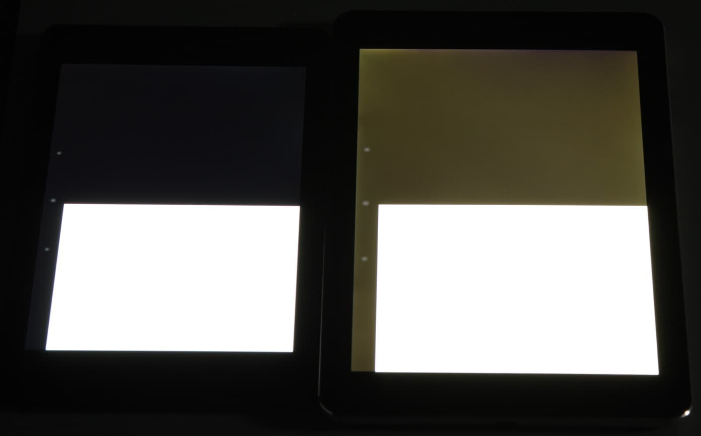 Экран имеет хорошие углы обзора в вертикальном направлении (здесь и далее при портретной ориентации), но при малейшем отклонении вправо инвертируются темные оттенки, при отклонении влево — светлые. Для сравнения приведем фотографии, на которых на экраны Nexus 7 и тестируемого устройства выведены одинаковые изображения, при этом яркость обоих экранов установлена примерно на 200 кд/м². Перпендикулярно к экранам тестовая картинка: