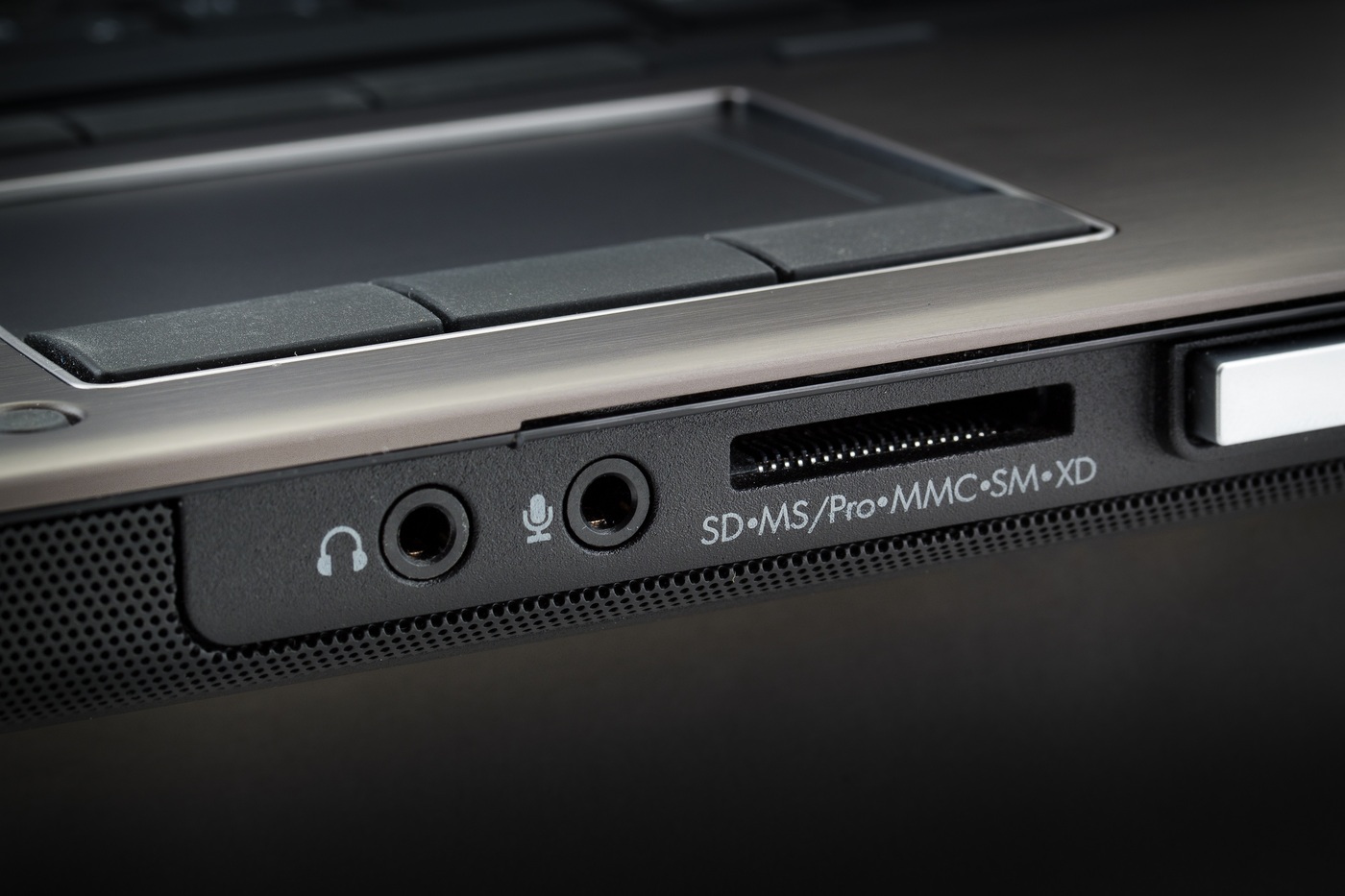 К сожалению, в этой модели аудоразъемы вынесены на переднюю грань. Они расположены прямо под тачпадом, то есть хотя бы не цепляются за рукава при печати. Но даже в этом случае пользоваться ими неудобно. Можно, конечно, сказать, что на профессиональной модели это не так важно, потому что использовать их будут редко, но это не всегда так — даже у нас в офисе многие сотрудники предпочитают работать в наушниках, чтобы не отвлекал внешний шум. Что уж говорить о крупных корпорациях, использующих схему единого помещения.