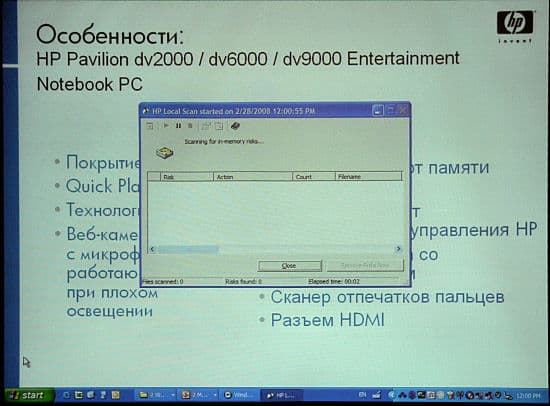 Подробные слайды с пояснением этих технологий были опущены, отдельно остановились только на сканере отпечатков пальцев, причем слайд с крупным изображением сопровождался следующим текстом ведущего: «Казалось бы — зачем нужен сканер отпечатков пальцев на домашнем ноутбуке, а ведь вот — пригодился! Такая технологическая штука!». И все! Ну, хорошо, что спустя пару-тройку лет после распространения технологии на рынке и HP стали его ставить (хорошо хоть не объявили, что первые на рынке), что понятно: сканер — штука, видимо, недорогая, а еще один повод сказать «Ух ты!» в магазине есть.