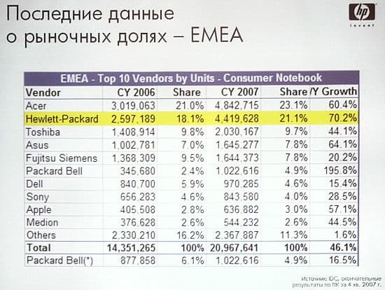 Как обычно, презентция началась с краткого рассказа о рынке и положении компании на нем. Вот некоторые результаты деятельности НР: оборот компании за первый квартал 2008 года составил 28,5 млрд. долл., рост — 13% (для сравнения, оборот компании за 2007 год — 104,3 млрд. долл.). Более конкретная статистика по отделению персональных систем компании: отгружено 42 миллиона устройств, доля на мировом рынке 21,7%, оборот 10,8 млрд. долл, рост 24%.