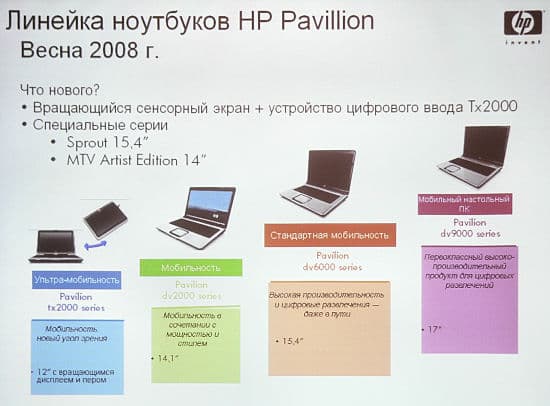 Первым был представлен маленький планшетный ноутбук серии ТХ2000. Модель впервые появилась на российском рынке весной прошлого года. Несмотря на первоначальную неуверенность в счастливой судьбе модели и опасения о неготовности рынка, ее продажи идут очень хорошо — модель одна из самых успешных в серии Pavilion.