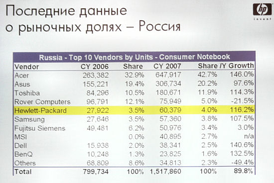 Ради интереса я второй раз задал вопрос, почему ноутбуки домашних серий от HP появились на российском рынке только в 2006 году, когда рынок мало того, что был уже поделен, так уже года два как переживал бум потребительского спроса. Понятно, что европейское отделение НР долгое время считала нас папуасами, недостойными приобщиться к столь замечательной продукции (и их не мог переубедить даже тот факт, что продажи корпоративных серий или тех же принтеров идет на ура), а когда обнаружило, что это не так — бросилось наверстывать упущенное, только было уже поздно…