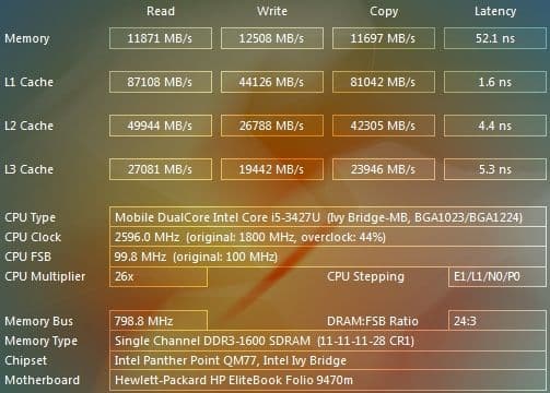 С одной стороны, в Elitebook Folio 9470m установлена память стандарта DDR3-1600, с другой — работает она в одноканальном режиме, поэтому общий результат в нашем тесте не очень высокий. При использовании двухканального режима памяти Ivy Bridge показывает около 17 000 МБ/сек.
