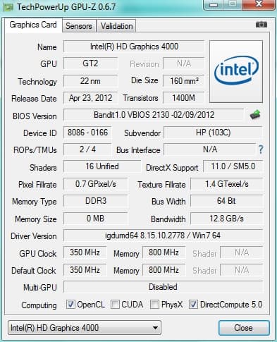 | Видеоподсистема | Intel HD Graphics 4000 |