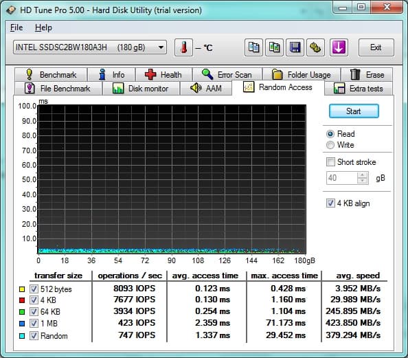 По количеству выполняемых операций накопитель выглядит очень хорошо. Например, если сравнить его c Acer Aspire S7, у которого SSD организован в RAID, то накопитель Elitebook Folio 9470m проигрывает при использовании больших блоков, но с маленькими блоками даже чуть быстрее.