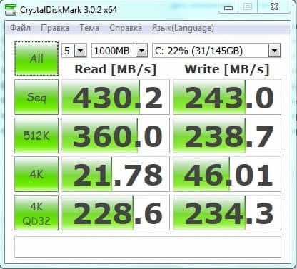 Наконец, посмотрим на производительность SSD. Сразу отмечу, что в тесте линейного чтения AIDA64 он показывает цифры в 500 МБ/сек, что на текущий день является очень хорошим результатом и соответствует спецификациям. Для проверки запустим другую утилиту.