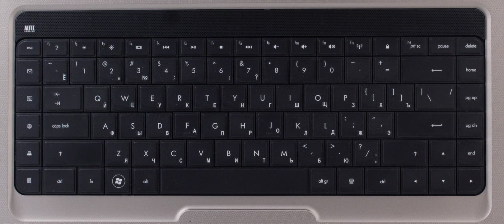 Кроме упомянутого светодиода, индицирующего состояние тачпада, на корпусе имеется индикатор питания, также индикаторами снабжен Caps Lock и клавиша переключения режимов беспроводной сети. Дополнительные клавиши, как уже отмечалось, составляют левый вертикальный ряд основной клавиатуры. И, конечно же, клавиши в верхнем ряду отвечают за традиционные функции регулировки яркости экрана, уровня громкости, переключение на внешний монитор и управления плеером. Причем, как мы уже наблюдали на ноутбуках HP, эти функции вызываются без нажатия префиксной клавиши, а нажимать ее необходимо, если вы хотите вызвать функции, закрепленные за клавишами F1-F12 в самих программах.